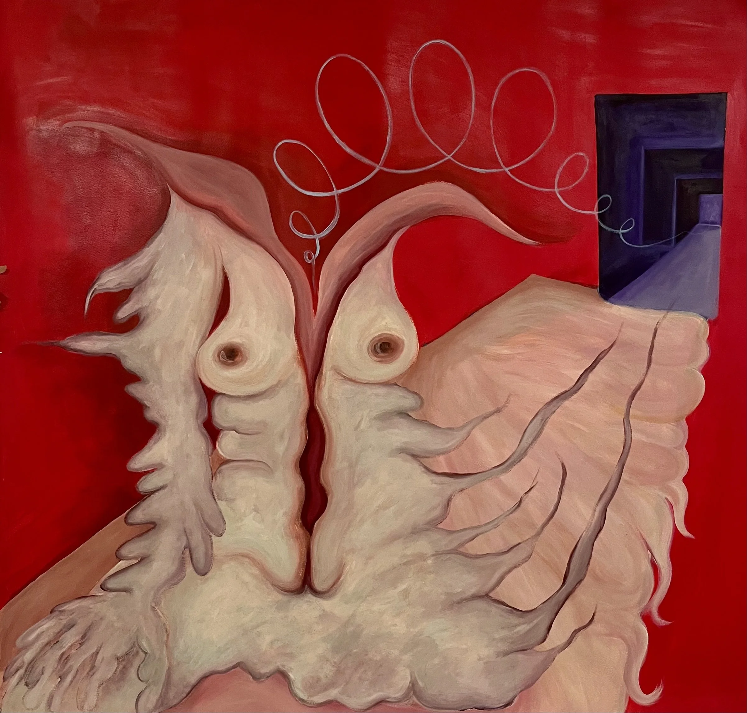 These paintings have served as field journal entries in examining the relationship between trauma and perception, body and mind, trying to understand the points of connection between discomfort that is both emotional and physical. I aim to use elements of surrealism and abstraction in forming psychological "landscapes", to describe the internal processing of experiences that happen to the body, having the figure(s) be the grounding point in physical reality; these figures ultimately exist within a sociological environment, which is another dimension that is distorted by the experience of trauma.