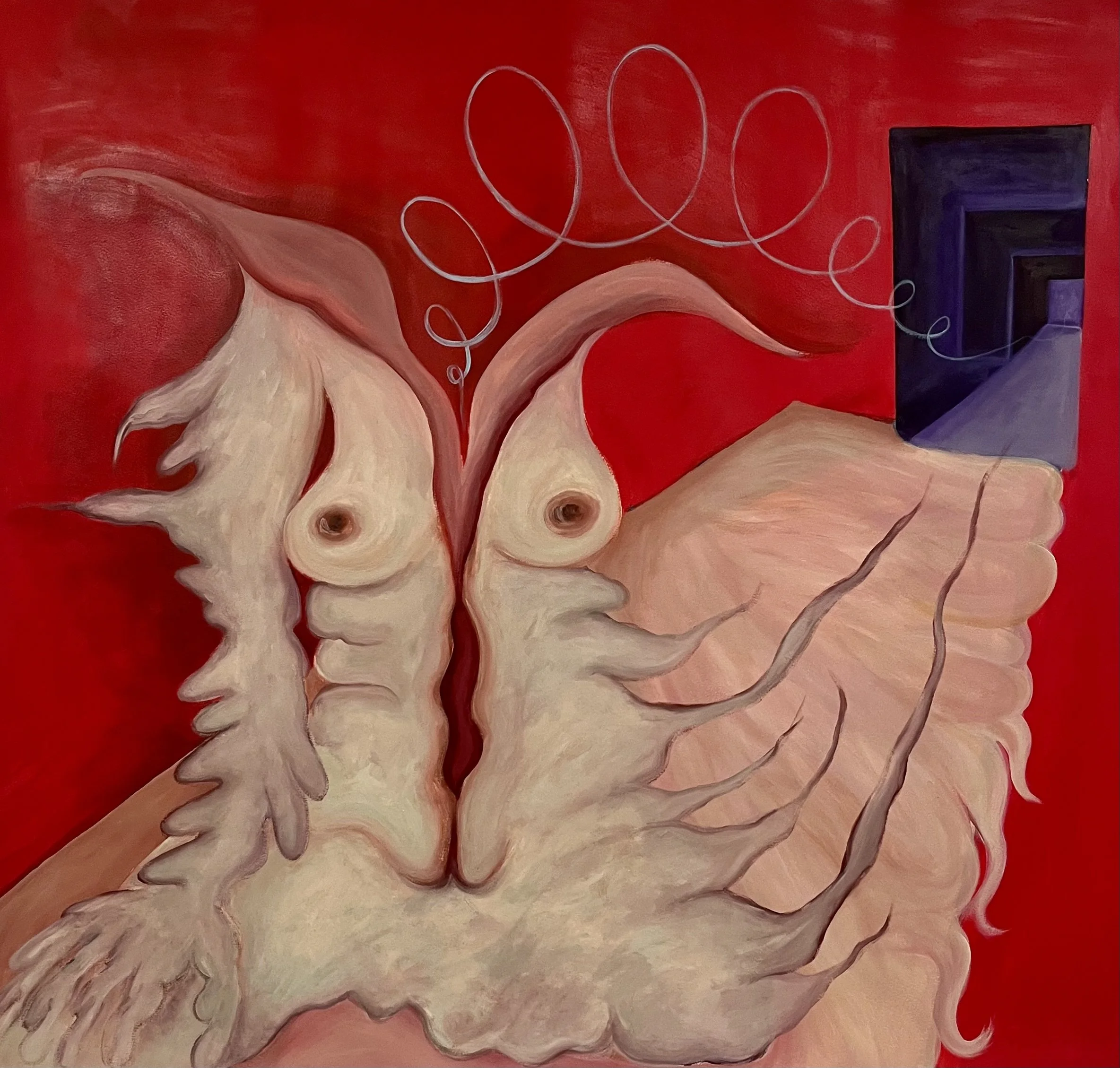 These paintings have served as field journal entries in examining the relationship between trauma and perception, body and mind, trying to understand the points of connection between emotional and physical pain and discomfort. These paintings aim to explore the results of the body’s exposure to violence. Through the use of elements of surrealism and abstraction in forming psychological "landscapes", the goal of the paintings is to describe the internal processing of violent and traumatic experiences that happen to the body, having the figure(s) be the grounding point in physical reality. By extension, I am interested in studying psychological phenomenas that lead to the disruption and distortion of external reality and perception of the self. As a result, these paintings contain themes of isolation, dissociation, paranoia, and disorder.
